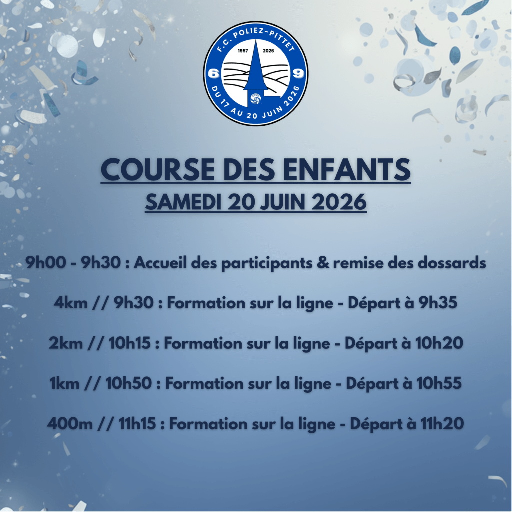La course des enfants aura lieu le samedi 20 juin 2026 à l’occasion du 69ème anniversaire du FC Poliez-Pittet !!!